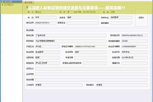 摘要:,,低保收入材料证明的提交流程包括收集相关证明材料、填写申请表格、递交至指定部门。注意事项包括确保材料真实有效、完整齐全,注意提交时限,遵循当地政策规定。提交低保收入材料证明时,应清晰明了地填写个人信息、收入状况、家庭情况,突出困难程度,同时确保签名和日期准确无误。