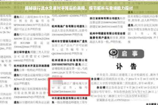 摘要:本文将探讨银行流水中的交易对手背后的真相和细节,探讨能否查到银行流水中的交易对手信息。通过深入了解银行流水的重要性和细节,揭示交易对手的隐秘性及其背后的原因,同时提醒读者注意个人隐私和信息安全。文章旨在帮助读者更好地理解银行流水中的交易对手信息,并提醒公众谨慎处理个人金融信息。