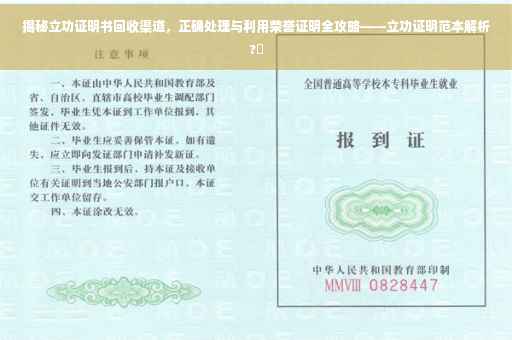 摘要:本文将揭示立功证明书的回收渠道,指导读者如何正确处理和利用这份荣誉证明。通过了解立功证明书的回收途径,读者可以更好地管理和保存自己的立功证明,同时发掘其潜在价值。本文还将提供立功证明范本,帮助读者了解如何规范填写和有效利用立功证明书。