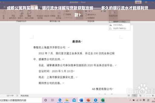 摘要:本文将详细介绍成都购买公寓时如何通过银行流水顺利获取贷款。文章将解释银行流水在贷款过程中的重要性,并提供关于准备和提供合适银行流水文件的指南。还将探讨成都买公寓时银行流水需要的时间长度,以帮助购房者更好地了解和准备相关材料。