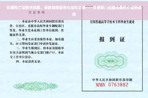 交通死亡证明书是处理交通事故死亡后续事宜的关键文件,家属在面临这样的悲剧时,应了解相关知识与应对方法,妥善办理交通死亡证明书以维护自身合法权益,社会各方面也应关注交通安全问题,共同营造安全、和谐的交通环境,减少悲剧的发生,希望每位读者都能重视交通安全,共同为构建和谐社会贡献力量。