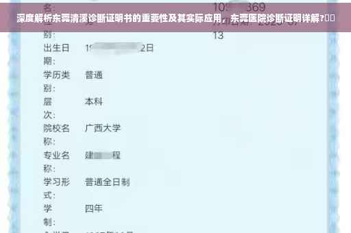 摘要:本文将深度解析东莞清溪诊断证明书的重要性及其实际应用。在东莞地区,诊断证明书是患者就医的重要凭证,具有法律效力。本文将从多个角度阐述诊断证明书的作用,包括证明患者病情、指导治疗、保障患者权益等。将结合实际案例,介绍诊断证明书在医疗纠纷、保险理赔、休假证明等方面的实际应用。