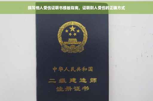 摘要:,,本文介绍了如何撰写他人受伤证明书,包括证明别人受伤证明书的模板。文章指出,撰写证明书需要遵循一定的格式和注意事项,如明确受伤人员的身份信息和受伤时间地点,详细描述受伤情况和伤势程度等。文章还提供了证明书模板供参考,帮助撰写者更好地完成证明书的撰写工作。