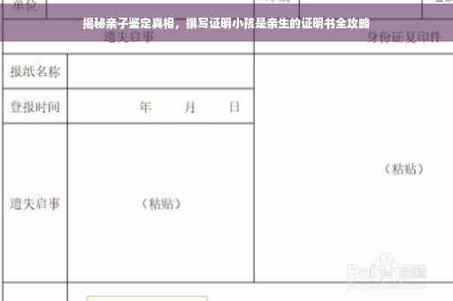 摘要:,,本文介绍了如何撰写证明小孩是亲生的证明书,并揭示了亲子鉴定的真相。文章指出,亲子鉴定是确认亲子关系的最准确方法,而证明书则需要包含鉴定机构、鉴定方法、鉴定结果等关键信息。本文旨在帮助公众了解亲子鉴定的流程和注意事项,确保亲子关系的真实性和合法性。
