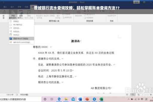 随着科技的发展,我们的生活越来越离不开银行,在处理金融事务时,我们经常需要查询银行流水来了解自己的账户情况,本文将详细介绍晋城银行流水的查询方法,帮助广大客户轻松掌握查询技巧,以便更好地管理自己的财务。