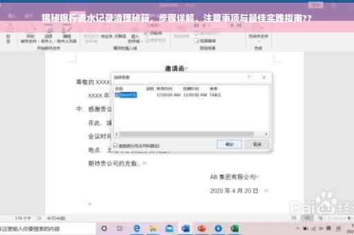 本文介绍了银行流水记录清理的全攻略,包括步骤、注意事项和最佳实践。读者将了解如何有效清理银行流水记录,包括注意事项以避免不必要的麻烦。文章详细阐述了清理过程中的关键步骤,同时提供了最佳实践建议,帮助读者更好地管理自己的财务记录。