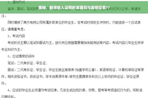 摘要:本文将揭示新房收入证明的真面目,探讨其背后的含义和作用。通过深入了解收入证明的重要性,我们将帮助读者了解如何获取真实有效的收入证明,并避免陷入不必要的麻烦。本文将介绍新房收入证明的基本概念和要点,帮助读者更好地了解这一重要文件的重要性。阅读本文,让您对新房收入证明有更清晰的认识。
