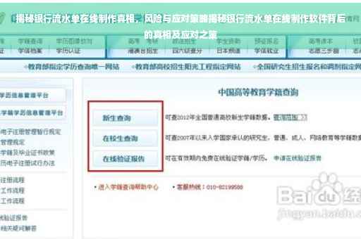 摘要:本文探讨了银行流水单在线制作的现象,揭示了真相并指出了存在的风险。文章介绍了某些软件声称能够在线快速生成银行流水单,但需注意这些行为可能涉及欺诈和虚假信息。本文也提供了应对之策,提醒公众保持警惕,避免陷入相关风险。正确获取银行流水单的方式应通过正规渠道,谨慎处理个人信息,增强网络安全意识。