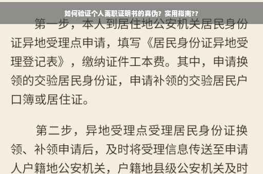 摘要:,,本文将介绍如何查证个人离职证明书及其真假的验证方法。通过了解离职证明书的格式和内容,可以初步判断其真实性。进一步可通过查询公司官网或人力资源部门联系方式,核实离职证明书的真实性。还可以对比签名、印章等细节,以及通过第三方认证机构进行查证。掌握这些方法,有助于确保个人离职证明书的真实可靠性。