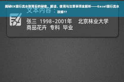 摘要:本文将揭示EX银行流水账背后的秘密,教你如何解读和使用银行流水账,包括注意事项。通过excel银行流水工具,让你轻松掌握个人或企业的资金流动情况。注意在解读过程中关注交易明细、账户余额等重要信息,并谨慎使用银行流水作为证明,确保信息安全。