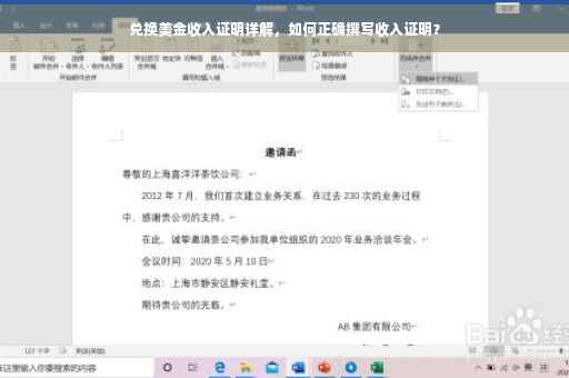 摘要:本文将详细介绍如何撰写兑换美金的收入证明。文章首先概述了收入证明的重要性和目的,然后详细解释了撰写过程中需要注意的格式、内容要点,包括证明书的标题、日期、被证明人的姓名、兑换美金的具体数额、兑换时间和地点等。还将强调证明文件的真实性和合法性,以及单位或公司的盖章和签名。本文旨在帮助读者了解如何正确撰写兑换美金收入证明,避免因格式或内容错误而导致的不必要的麻烦。