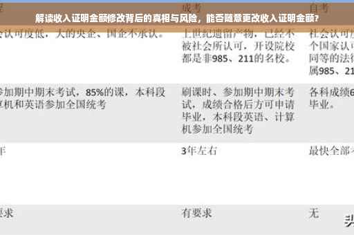 关于收入证明金额是否可以修改的问题,背后涉及真相与风险。真相是,在某些情况下,收入证明金额是可以进行修改的,但这并非随意行为。需根据具体情况,如企业规定、合同条款等来决定。修改收入证明金额也存在风险,如可能导致信用受损、法律纠纷等。在修改前需慎重考虑,确保了解相关风险并遵守相关规定。