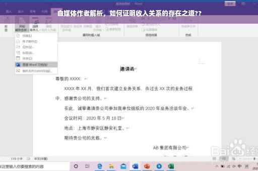 自媒体作者角度解析收入关系的证明方法。文章将探讨如何通过有效的方式证明收入关系的存在。包括展示稳定的收入来源、合理的财务记录、以及分享个人的收入情况和成功案例等。这些方法有助于读者理解并信任自媒体作者的收入状况,进而增强自媒体内容的可信度与影响力。这篇文章将为你揭示如何有效证明收入关系的秘诀。