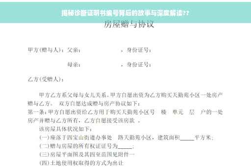 摘要:,,本文探讨了诊断证明书的背后故事与深度解读,重点关注证字第号的含义。文章介绍了诊断证明书的重要性及其编号所蕴含的信息。通过解析编号,揭示出诊断证明书的唯一性、患者病情的紧急程度以及医疗机构的标识。本文也强调了诊断证明书在医疗领域中的关键作用,为患者提供有力的证明依据。