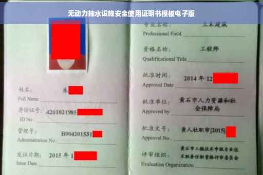 摘要:,,本安全使用证明书模板专为无动力抽水设施设计,采用电子版形式,方便使用和管理。该证明书旨在确保无动力抽水设施的安全使用,明确设备的使用条件和注意事项,以保障用户的安全。通过使用此模板,用户可以方便快捷地获取无动力抽水证明书,确保设备在安全的前提下发挥最大效用。