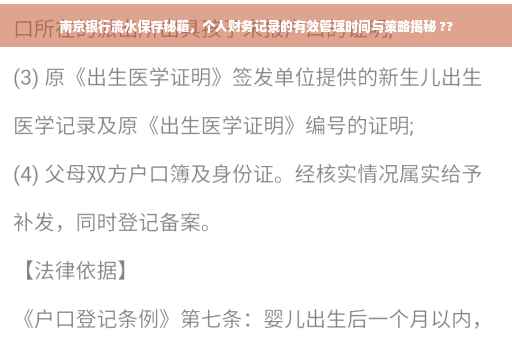 通过本文的介绍,相信你已经对南京银行流水保存时间有了更深入的了解,也学会了如何有效管理个人财务记录,在日常生活中,我们应该注重保护个人隐私和账户安全,合理管理个人财务,为未来的发展和生活做好充分的准备。