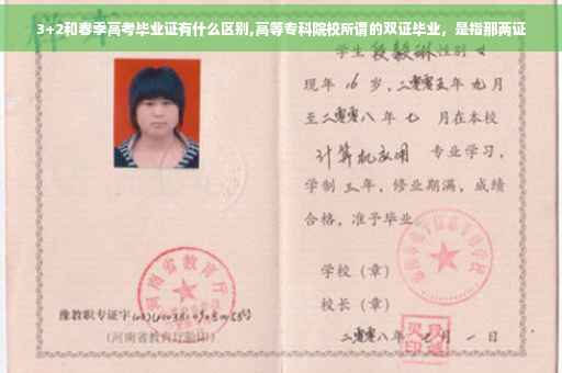 3+2和春季高考毕业证是不一样的,3+2是初中考入中专,三年以后再继续读两年专科也就是高职之类的,然后毕业证是3+2专科,而春季高考和夏季高考差不多,只不过就是提前录取,然后职业学院和独立学院居多,且只能在本省内上本科,毕业之后学历就是普通本科学历。