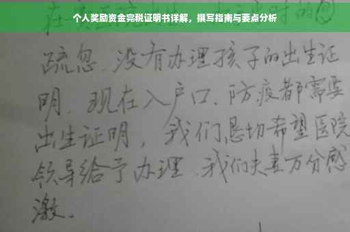 假设某员工小张在一年内获得了10万元的年终奖,根据相关税率,他需要缴纳2万元的税款,小张按时向税务部门申报了年终奖纳税事项,并足额缴纳了税款,随后,他向税务部门申请了个人奖励资金完税证明书,在申请过程中,小张需要提交相关的证明材料,如奖金通知、银行转账记录等,税务部门审核通过后,为他出具了个人奖励资金完税证明书。