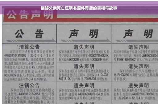 摘要:本文将揭示父亲死亡证明书原件的真相和背后故事。这份原件是证明父亲死亡的官方文件,其背后隐藏着许多情感和故事。通过了解父亲死亡证明书原件的定义、作用以及获取过程,读者可以更好地理解其与家庭、法律和社会的关系,并引发对生命和死亡的深思。