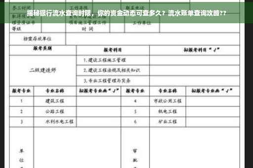 摘要:本文将介绍银行流水查询时限,让读者了解他们的资金动态能够被查询多久。通过查询不同银行的流水账单,读者可以了解自己的账户活动情况。本文将涵盖银行流水账单查询的时间范围,帮助读者更好地管理自己的财务。