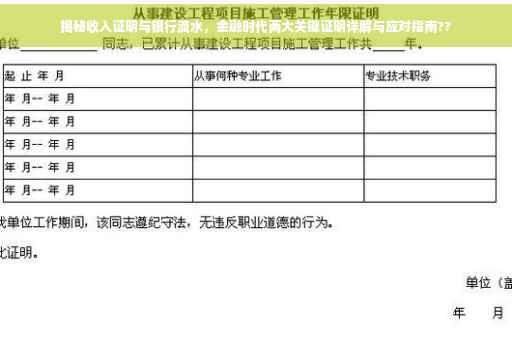摘要:本文将揭示收入证明与银行流水在金融时代的重要性,并教你如何正确应对这两大关键证明。收入证明是证明个人或企业收入状况的文件,而银行流水则反映了资金往来情况。了解两者的内容和作用,有助于个人信用评估、贷款申请等金融活动。本文将为你解读这两大证明的具体内容,助你更好地应对金融挑战。