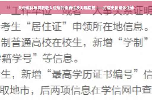 随着社会的进步和人民生活水平的提高,越来越多的家庭面临着父母退休的问题,退休后,由于收入来源的变化,一些家庭可能需要处理贷款问题,如购房、子女教育等,这时,一份有效的贷款收入证明就显得尤为重要,本文将详细介绍父母退休后贷款收入证明的重要性及如何办理。