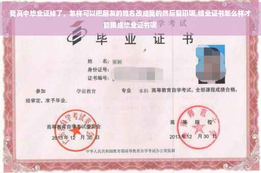 高中毕业证掉了,最好不要把朋友的姓名改成自己的, 高中毕业证书由省教育厅统一管理,省、市两级教育主管部门审查、验印,毕业证书一律于毕业当年颁发,不予补发。但教育局可以办理基础教育学校毕业证书遗失证明,具体程序如下:(1)本人到原毕业学校查核毕业证书存根或出具证明;(2)本人登报声明原证遗失作废;(3)本人持证明、报纸、照片等材料到市教育局基础教育科申报;(4)教育局核发遗失证明。 如果只是出国留学需要,到学校开具高中毕业证明及高中三年学习成绩后,再到公证处做个公证也就可以了。