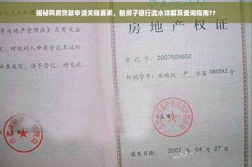 摘要:购房贷款申请过程中,银行流水是关键要素之一。本文将揭秘新房子银行流水的查询方法,包括查询途径和注意事项。通过了解银行流水的重要性,帮助购房者顺利申请贷款,避免不必要的麻烦。本文旨在提供实用的购房指南,让购房者更加了解银行流水的重要性及查询方法。