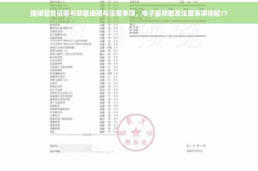 摘要:获取薪资证明书需注意途径正规可靠,包括公司人事部门、银行或在线电子证明平台等。注意事项包括核实证明真实性、保护个人隐私及遵守相关规定。查看薪资证明书电子版可通过公司官网、个人邮箱或相关电子证明平台。在获取和使用过程中,务必谨慎以确保信息安全和合规性。