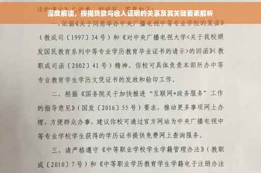 摘要:本文将深度解读贷款过程中的关键要素,探讨按揭贷款与收入证明之间的关系。按揭贷款作为购房的主要方式,收入证明是贷款审批的重要依据之一。本文将介绍按揭贷款的基本概念和流程,以及收入证明在其中的作用,分析收入证明如何影响贷款额度、利率等关键因素,并强调在贷款过程中需要注意的事项。让读者了解如何正确准备收入证明,提高贷款申请的成功率。