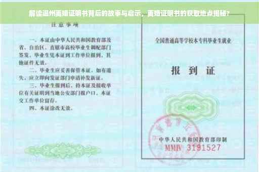 摘要:温州的离婚证明书是当地离婚手续的重要证明文件,其背后蕴含着许多故事与启示。想要获取这份证明书,需前往当地民政局或婚姻登记处办理。这份证明书不仅是一张纸,更是离婚双方走向新生活的重要里程碑,同时也反映了当代社会婚姻观念的变迁。通过解读温州的离婚证明书,我们能够更好地理解当代社会的婚姻状况和家庭关系的变化。