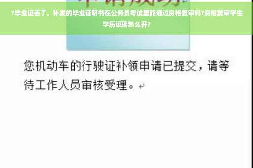在公务员考试的资格复审环节,需要考生出具毕业证和学位证及相关证件的原件。 如果原件遗失,必须到原毕业学校补办,毕业证明书是在宣布毕业证原件丢失作废后补办的毕业证书,两者效力一样,法律上没有差别。 建议提前和审核的用人单位或者人事部门好好沟通说明情况。