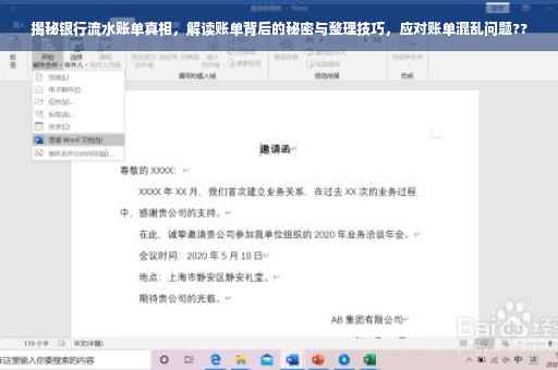 摘要:本文将揭示银行流水账单的奥秘,解析账单背后的真相并分享整理技巧。面对繁杂的银行流水账单,我们将提供有效的解决方案,帮助您轻松管理和理解账单内容。通过掌握正确的整理方法和解读技巧,您将能够轻松应对银行流水账单的混乱状况。