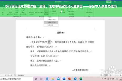 农行银行流水必须本人办理,流程包括持身份证和银行卡到银行网点柜台办理,或在线上通过网上银行查询打印。注意事项包括保护个人信息和密码安全等。常见问题解答中包括是否需要本人到场的问题,答案是肯定的。办理农行银行流水必须本人前往,以确保信息安全和隐私保护。