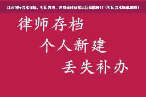 摘要:,,本文介绍了江西银行流水的详细操作,包括如何打印银行流水账单、注意事项以及常见问题的解答。读者可以通过本文了解如何获取银行流水记录,包括打印的具体步骤和所需的材料。文章也提醒了注意事项,如保护个人信息等。对于常见问题,本文也给出了相应的解答,帮助读者顺利打印江西银行流水账单。