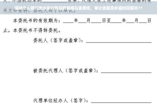 摘要:审计调查个人银行流水是揭示个人经济活动真相与重要性的关键环节。这一过程耗时因多种因素而异,包括银行效率、流水数据规模等。通过审计,我们能更准确地了解个人经济行为、识别潜在风险,如欺诈、洗钱等。这不仅有助于维护金融秩序,还能为个人提供财务管理指导。审计个人银行流水至关重要。