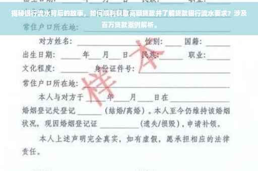 揭秘银行流水的重要性及其在获取高额贷款过程中的作用。了解如何通过合理的银行流水顺利获得100万贷款。本文将指导你关注银行流水背后的故事,包括其数额、频率和稳定性等因素,以帮助你成功获取贷款。关注本文,轻松了解银行流水与贷款之间的关联。