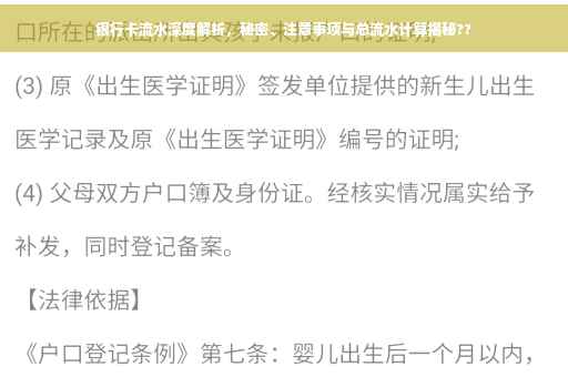 摘要:本文探讨了银行卡流水的秘密和注意事项。文章指出,银行卡流水对于个人财务管理至关重要,其中不为人知的秘密包括某些交易可能不计入总流水。读者需要了解这些细节以避免误解和不必要的麻烦。本文还提醒读者注意保护个人隐私和账户安全,避免泄露个人信息和交易密码。本文旨在帮助读者更好地管理银行卡流水,确保个人财务安全。