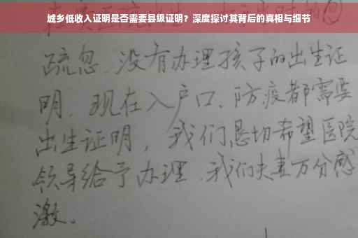 摘要:关于城乡低收入证明是否需要县级证明的问题,文章探讨了背后的真相与细节。文章指出,具体规定可能因地区而异,一般需要县级或县级以上政府相关部门出具证明。文章还介绍了如何撰写城乡低收入证明,包括证明的目的、申请人的基本信息、家庭收入情况等。开具低收入证明时需遵循相关规定,确保证明的真实性和有效性。