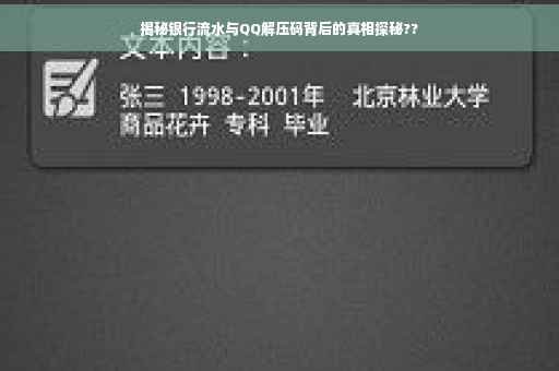 随着互联网的普及,越来越多的人开始关注自己的个人财务管理,银行流水作为个人财务状况的重要体现,一直是人们关注的焦点,近期出现了一种现象,那就是通过QQ解压码获取银行流水信息,这背后究竟隐藏着怎样的秘密呢?本文将为您揭开这一神秘面纱。