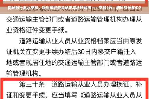 摘要:通过银行流水贷款,可轻松获取2万贷款资金。该贷款方式的利息因银行和贷款期限不同而异,需根据个人具体情况而定。想要了解银行流水贷款的细节和利息情况,建议咨询相关银行工作人员,获取更准确的贷款方案和利率信息。