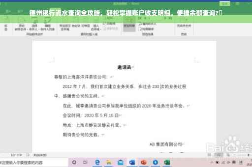 德州银行流水查询指南,为您提供便捷查询账户收支明细的方法。轻松掌握个人或企业账户资金流动情况,保障财产安全。通过简单步骤,即可查询德州银行余额,助您轻松管理个人财务。跟随指南操作,轻松掌握账户动态,让您的资金一目了然。