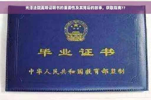 摘要:光泽法院离婚证明书是离婚案件中的重要证明文件,其背后蕴含着许多真实的故事。这份证明书是证明婚姻关系已经解除的官方文件,具有法律效力。想要获取光泽法院离婚证明书,需要前往光泽法院进行办理,并准备相关材料。其重要性不言而喻,因为它涉及到个人权益和法律问题。
