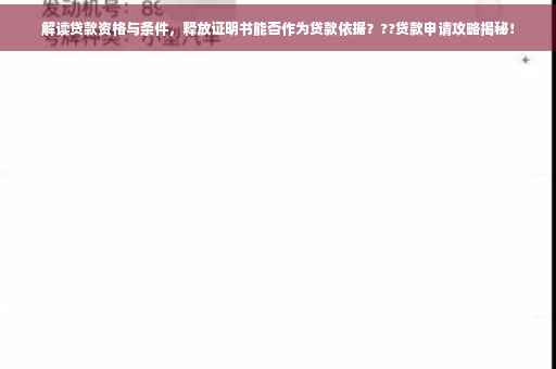 随着金融市场的不断发展,越来越多的人开始关注贷款问题,释放证明书作为一种证明个人身份和背景的文件,经常被人们问及是否可以作为贷款的资格证明,本文将详细解读释放证明书在贷款过程中的作用,同时探讨贷款资格与条件,帮助读者更好地了解贷款相关知识。