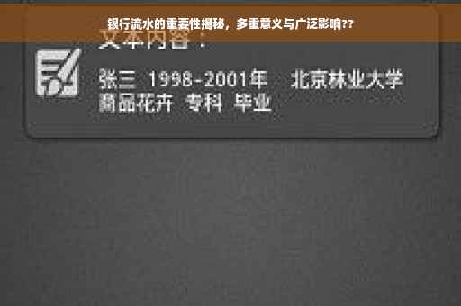 随着现代社会经济的快速发展,银行业务与我们的日常生活紧密相连,银行流水作为个人和企业经济活动的重要记录,其重要性日益凸显,本文将深入探讨银行流水的定义、功能及其在多个领域的影响,以帮助读者更好地了解其价值。