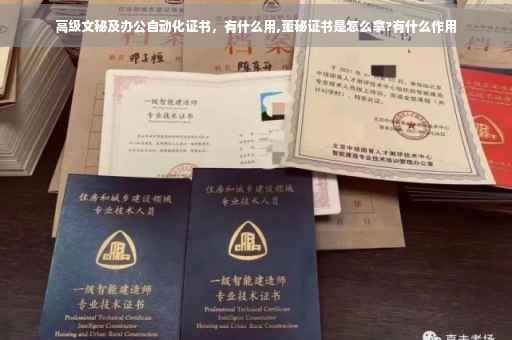高级文秘证和办公自动化证就是一个证,本证书为教育部中国高教学会秘书学专业委员会组织实施和颁发的《中国秘书岗位资格证书》,本证书是秘书从业人员的就业岗位资格证。由秘书学专业委员会统一命题统一组织考试。 因为是为国际、国内双认证证书,除了满足学员就业需要,也满足从业人员提高技能的需要,具有实用性、通用性和开放性的特点,是较高层次的秘书资格认证项目。