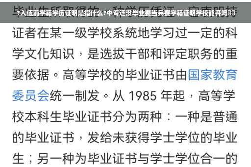 入伍前学籍学历证明是指的什么?入伍前学籍证明和学历证明指的是,如果你是在校大学生,那么在学校入伍,就己经证明了你的学籍,不用再开什么证明,因为有学校为你做担保,因为是在校大学生,还没有取得学历,所以国家要保留你的学籍,服役期满后返校完成学业,取得学历