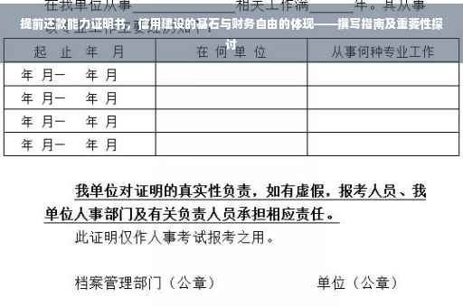 提前还款能力证明书在个人信用建设和财务自由方面具有重要意义,通过提前还款行为,个人能够展现自己的信用状况和经济实力,为个人的金融活动和发展带来更多机会,我们应当重视提前还款能力证明书的作用,努力提升自己的金融素养和理财能力,为个人的信用建设和财务自由奠定坚实基础。