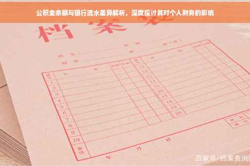 摘要:本文将深度解析公积金余额与银行流水的关系及其影响。当公积金余额与银行流水不一致时,可能涉及多种原因,如提取公积金后的余额变动未及时同步等。了解二者的差异有助于个人财务管理和决策,如贷款申请等。本文将探讨如何解读这些差异,并强调理解这些概念的重要性。
