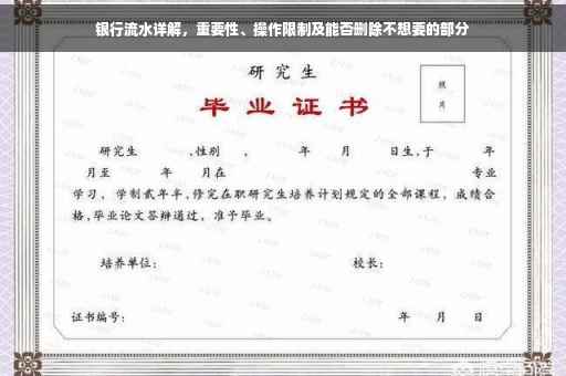 摘要:银行流水是记录个人或企业银行账户交易的重要文件,具有法律效力,不能随意删除或修改。银行流水的重要性在于其作为财务交易的证明,用于核实收入、支出及账户活动情况。操作限制方面,个人或企业无法通过简单方式删除不想要的部分,必须遵循银行规定和法律法规。应谨慎对待银行流水,妥善保管。